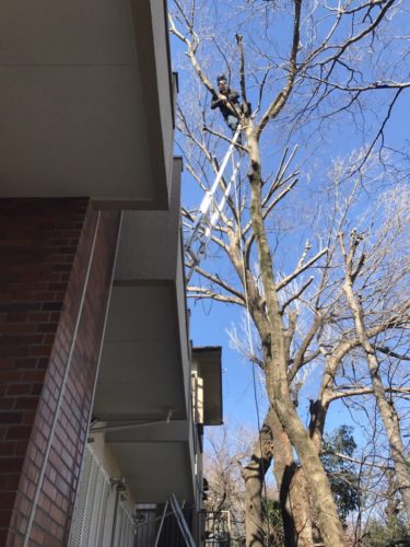 渋谷区の植木屋お庭まかせ隊では、こういった高所での特殊剪定作業も承っております。