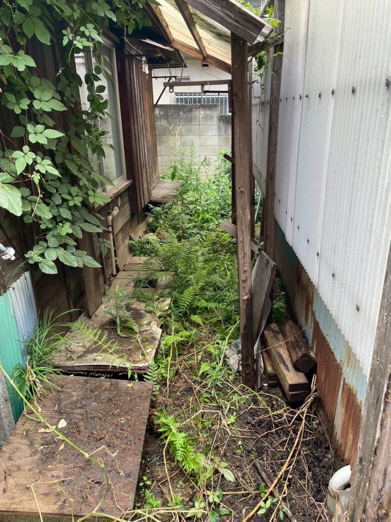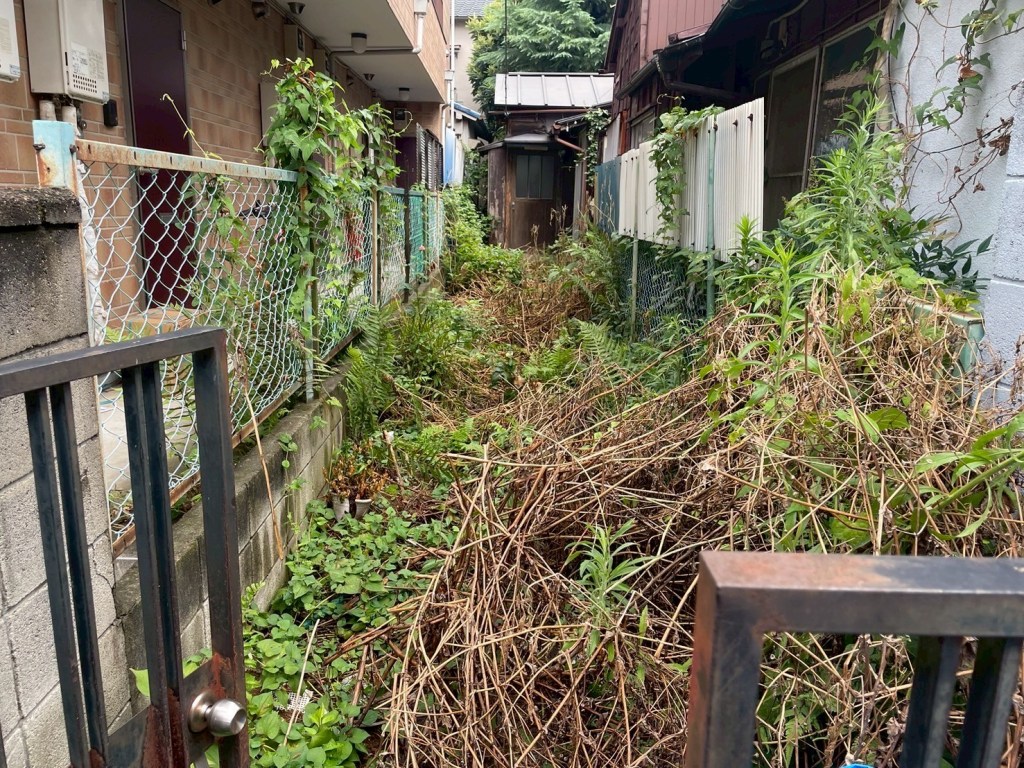 写真をご覧いただくと分かるように、壁際や足元にはびっしりと雑草が生い茂っていました。